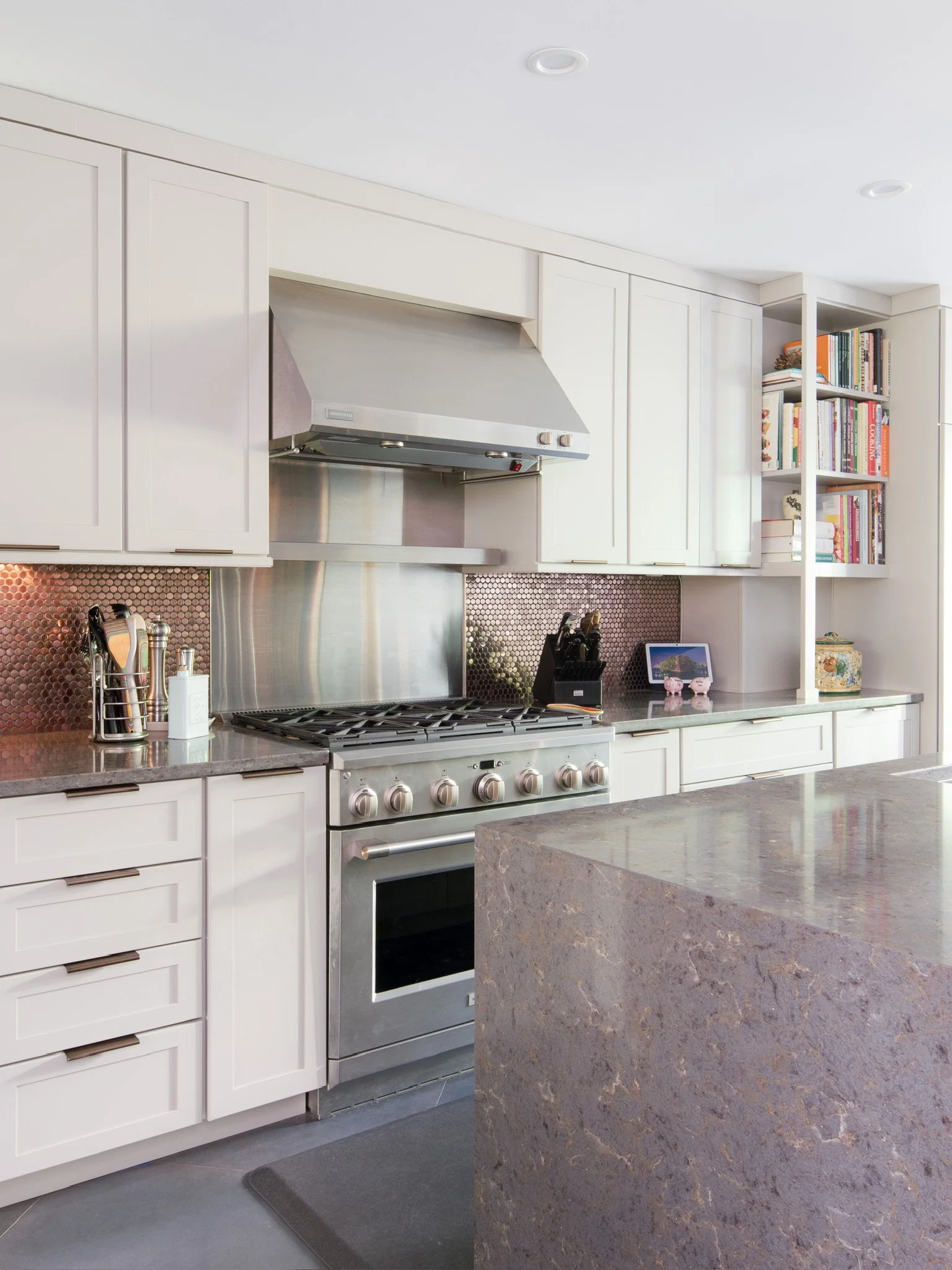 Diana Warner helped the O’Connor family bring their vision to life using inset cabinets in Quarter Sawn White Oak with a handwiped stain, a paint matched cabinet and more QSWO in the primary bath.